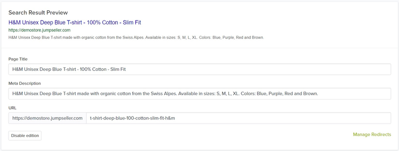 Tu tienda ya está determinada para ser amigable en SEO, sin embargo, todavía necesitas agregar los datos relevantes para que Google pueda indexar tus páginas. Agrega el Título de la Página, la Meta Descripción y edita la URL.